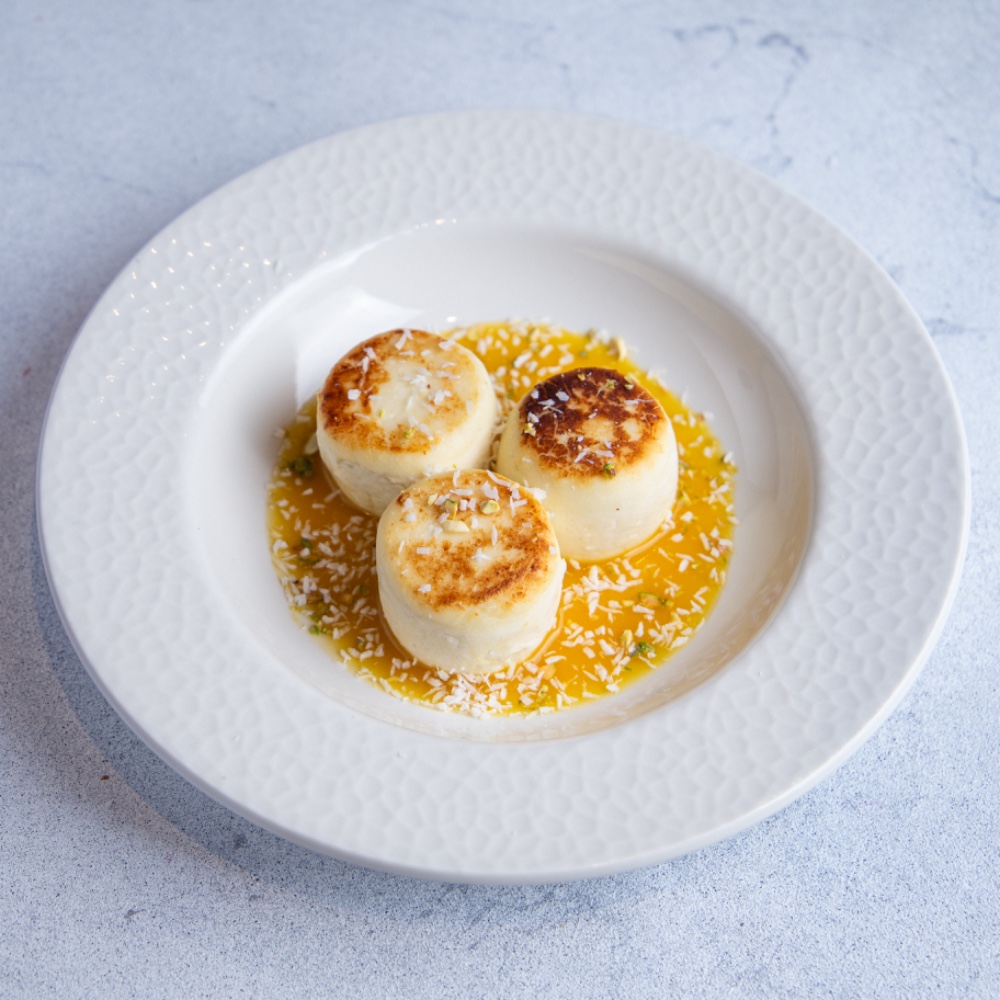 Безлактозні сирнички з пюре манго і кокосовою стружкою