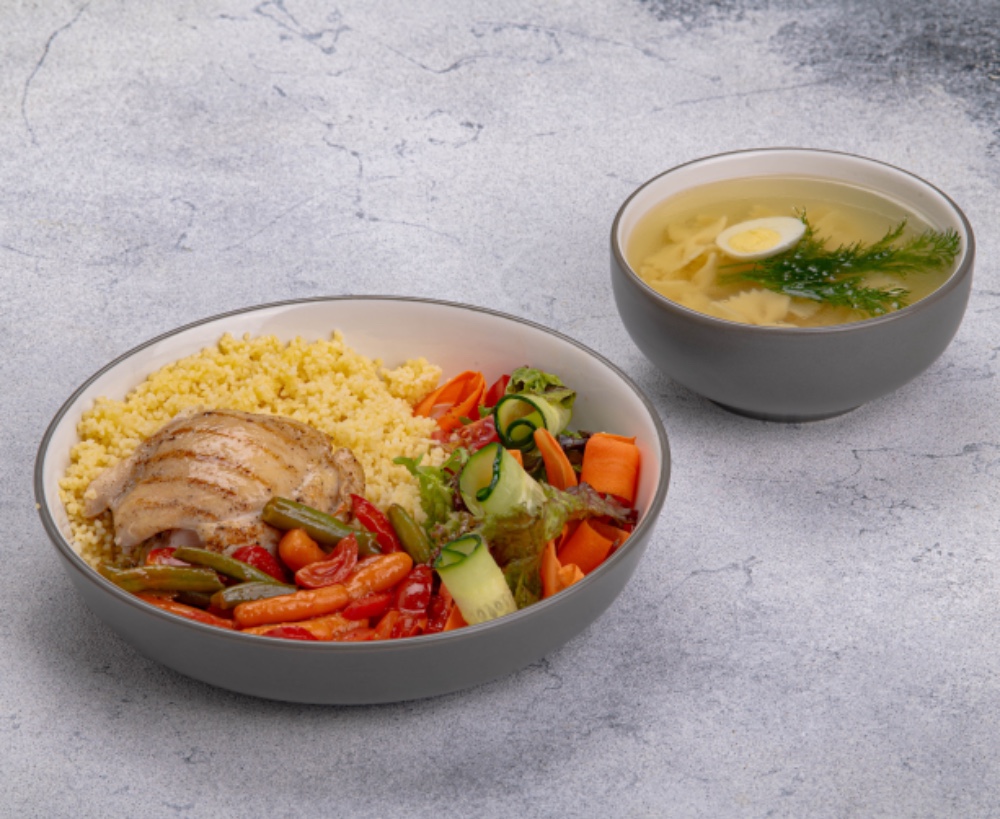 Ланч кус-кус з курячим стегном та овочами в соусі солодкий-чилі + бульйон у подарунок