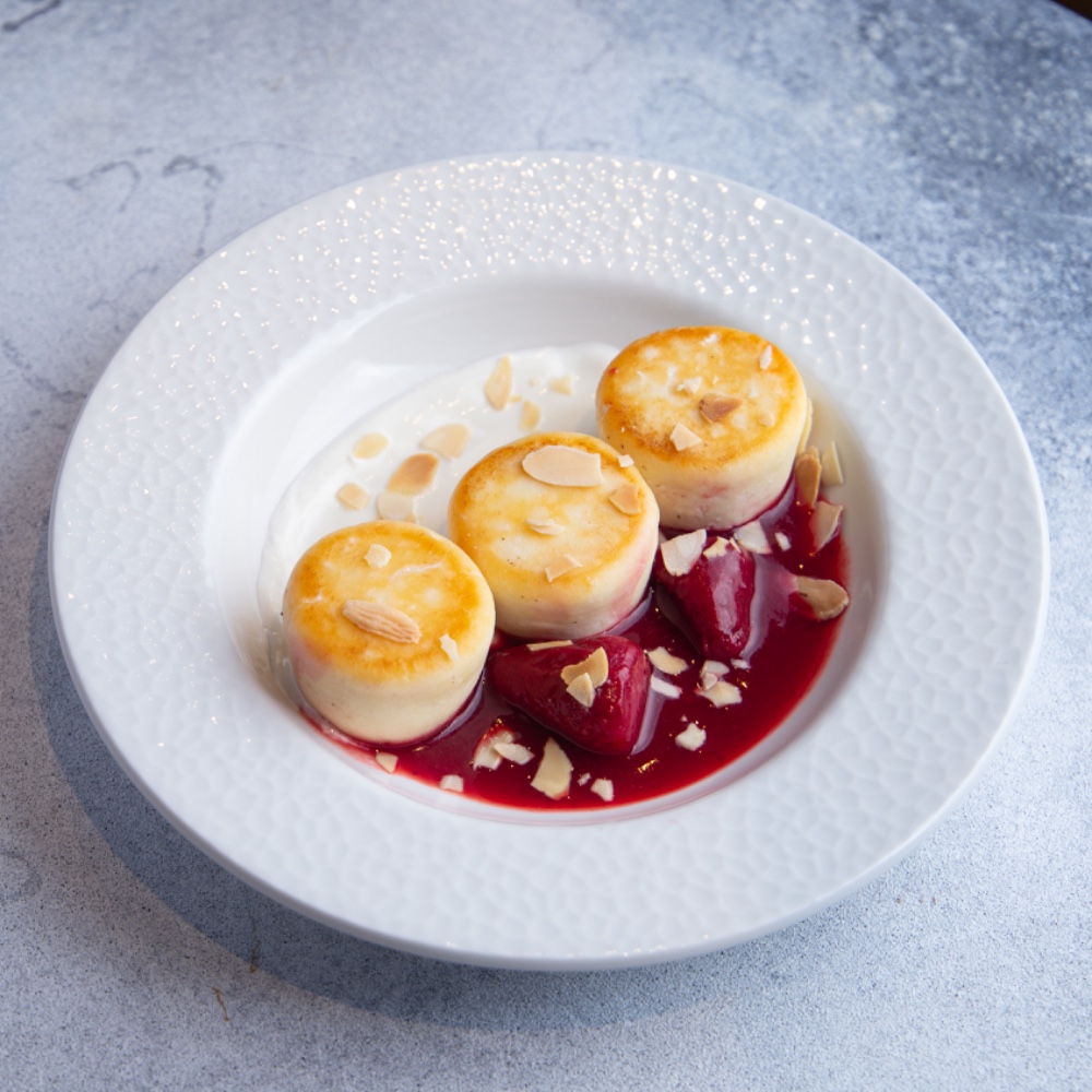 Класичні сирнички з полуничним конфі, сметаною і мигдальними пластівцями